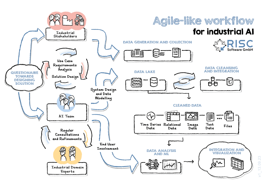 Wie wir im vorangegangenen Abschnitt gesehen haben ergibt, sich durch die zahlreichen Herausforderungen meist ein beträchtlicher zeitlicher Aufwand bis aussagekräftige Ergebnisse aus der Produktion vorhanden sind. Manchmal wird dieses Ziel nicht erreicht, weil es zu komplex ist und der Fokus verloren geht. Deshalb verfolgt die RISC Software GmbH einen agilen Ansatz (mit starker Einbindung der tatsächlichen Akteure) bei KI-basierter Datenanalyse im industriellen Bereich.
