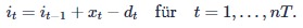 Aber wie sollen sich diese Variablen nun verhalten? Notwendige Nebenbedingungen werden in weiterer Folge das Zusammenspiel der Variablen festlegen. Als zweiten Schritt der Modellierung identifiziert Otto zwei solcher Nebenbedingungen: die Materialflussgleichung, welche die Lagerstände und deren Ab- und Zuflüsse pro Monat beschreibt, und die Werkstattungleichung, welche die Verwendung der Werkstatt beschreibt. Der Lagerstand ​itt​ im Monat t lässt sich durch den Lagerstand des Vormonats ​it-1​, durch die Produktion ​xt​ und den Bedarf ​dt​ des aktuellen Monats t charakterisieren: