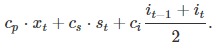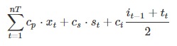 Als letzten Schritt beschreibt Otto die Kosten der Produktion mittels einer Kostenfunktion (oder einer Zielfunktion). Die anfallenden Kosten unterteilen sich in Kosten für Produktion, Lager und Werkstatt und werden durch die Koeffizienten cp, ci und ​cs abgebildet (cp = 25, ci = 2, cs = 500 ). Die Kosten pro Monat t lassen sich somit wie folgt beschreiben: