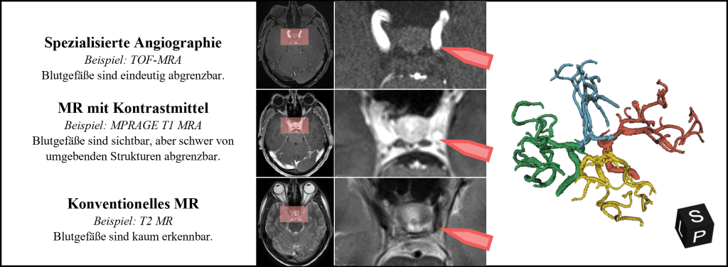 Wie einfach sich Blutgefäße in den Bilddaten von den umgebenden Strukturen abgrenzen lassen, hängt in erster Linie von der verwendeten Bildgebungsmethode ab. Die Magnetresonanzbildgebung (MR) bietet den Vorteil, dass sie nicht-invasiv ist und ohne den Einsatz von Röntgenstrahlen auskommt. Zudem stehen den Radiolog*innen unterschiedliche Sequenzen zur Verfügung, um verschiedene Gewebeeigenschaften zu betonen und so bestimmte anatomische Strukturen hervorzuheben. Die Time-of-Flight (TOF) Sequenz ermöglicht etwa den Blutfluss innerhalb der Arterien abzubilden, ist aber aufgrund des schwachen Kontrasts schlechter für die Beurteilung von Gehirngewebe geeignet als vergleichsweise die T2 Sequenz. Welche Sequenzen bei der Bildaufnahme zum Einsatz kommen, ist abhängig von der medizinischen Indikation und die Anzahl an verschiedenen Sequenzen wird zugunsten der Aufnahmedauer eingeschränkt. Bilddaten sind deshalb oft nicht verfügbar, was eine Beurteilung der Blutgefäße erschwert oder gar unmöglich macht. Abbildung 2 veranschaulicht die Sichtbarkeit von Blutgefäßen in unterschiedlichen MR-Sequenzen.