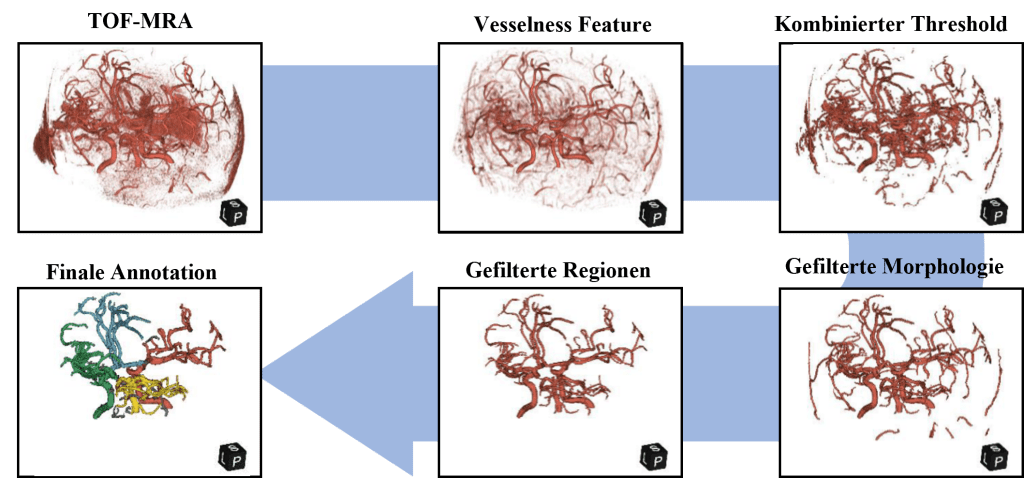 Abbildung 3: Die automatische Methode zur Annotation der Blutgefäße und Gefäßregionen in der angiographischen TOF-MRA Sequenz basiert auf traditionellen Bildverarbeitungsmethoden.