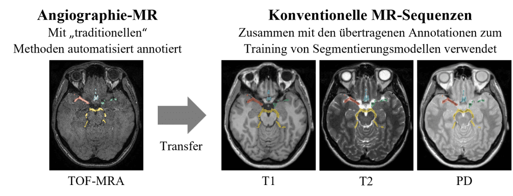 Abbildung 4: Die annotierten Blutgefäße aus der TOF-MRA Sequenz wurden auf die nicht-angiographischen Sequenzen (PD, T1, T2) übertragen. Der resultierende Datensatz aus Bilddaten und „Ground-Truth“ Annotationen wurde anschließend für das Training der Segmentierungsmodelle verwendet.