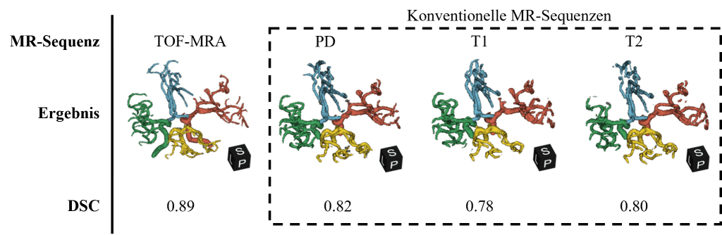 In der Literatur fehlen vergleichbare Studien, die auf konventionellen, nicht-angiographischen Bilddaten basieren. Klimont et al. [6] beschrieben eine Methode für nicht-angiographische CT-Bilddaten, jedoch nicht für MR-Sequenzen. Die Ergebnisse der Forschenden für die TOF-MRA Sequenz sind vergleichbar mit Werten aus der Literatur [7] und bieten durch die Unterstützung nicht-angiographischer MR-Sequenzen einen einzigartigen Vorteil.