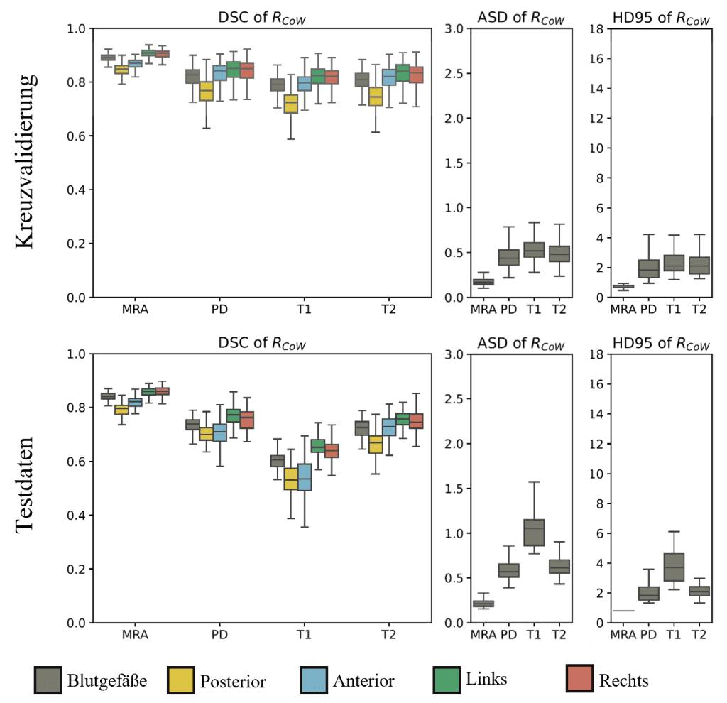 Abbildung 6: Detaillierte Auswertung der Metriken DSC, ASD und HD95 im Bereich des Circle of Willis im Rahmen der Kreuzvalidierung (oben) und für die zusätzlichen Testdaten (unten). Die Blutgefäße wurden in einem allgemeinen Label und zusätzlich für jede Gefäßregion (Posterior, Anterior, Links, Rechts) ausgewertet. Die Ergebnisse beziehen sich auf die jeweilige MR-Sequenz: (TOF-)MRA, PD, T1 und T2.