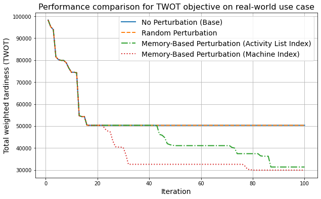 Die Motivation für dieses Framework war die Lösung realer, dynamischer Scheduling-Probleme mit umfangreichen Restriktionen, wie sie von einem Industriepartner der RISC Software GmbH bereitgestellt wurden. Das MBP-Framework wurde auf einer solchen Instanz mit 905 Arbeitsschritte und 67 Maschinen evaluiert und hat sich als effektiv erwiesen. Die zwei umgesetzten Operatoren des MBP-Frameworks, mit bestmöglichen Parametereinstellungen, bringen erhebliche Verbesserungen der berücksichtigten Zielfunktionen, siehe Abbildung 3 für ein solches Beispiel.