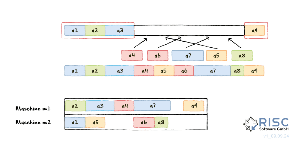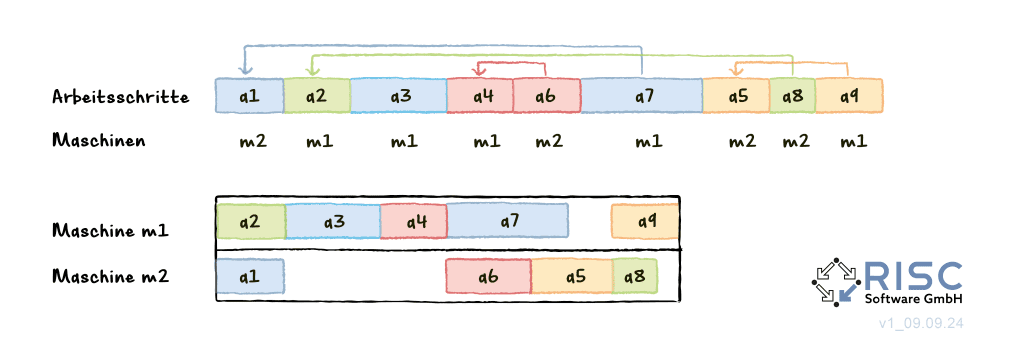Abbildung 1: Neun Arbeitsschritte, in fünf Aufträge, und zwei Maschinen (oben) und eine mögliche Zuteilung auf Maschinen (unten)
