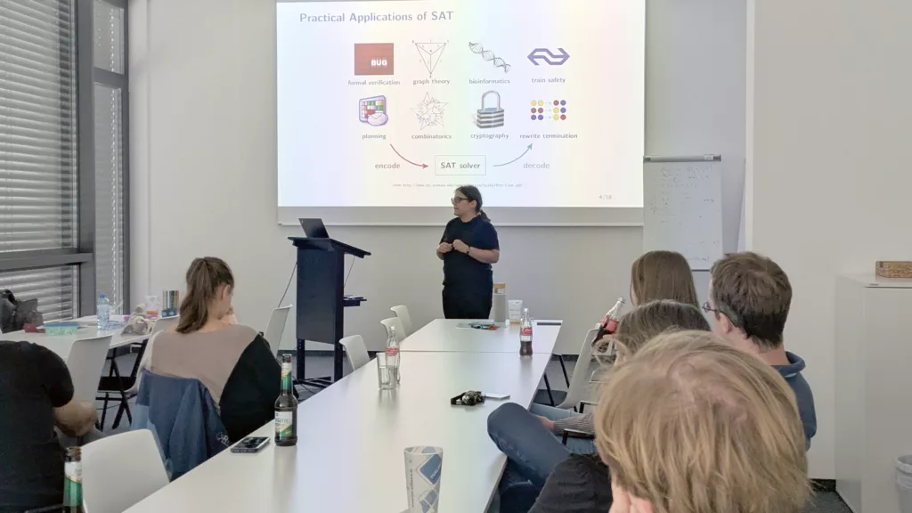 Unter dem Titel „Never trust your solver: Certificates for SAT“ sprach Prof. Seidl über die Herausforderungen beim Einsatz automatisierter Prüfverfahren in der Softwareentwicklung. Im Mittelpunkt stand die Frage: Wie können sogenannte SAT-Solver – Programme, die logische Probleme lösen – nachvollziehbare und überprüfbare Ergebnisse liefern? Und wie lässt sich sicherstellen, dass diese Programme auch dann zuverlässig arbeiten, wenn sie in sicherheitskritischen Bereichen eingesetzt werden?