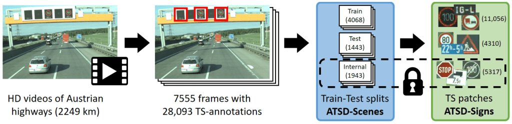 Entwicklung des ATSD. 7555 Frames mit Verkehrszeichen wurden aus HD-Videos extrahiert und anschließend annotiert. Nach dem Herausfiltern nicht valider Aufnahmen wurden die verbleibenden 7454 Frames in Trainings-, Test- und interne Sets aufgeteilt, die ATSD-Scenes bilden. ATSD-Signs besteht aus Verkehrszeichen-Patches, die aus den Frames in den jeweiligen Splits extrahiert wurden.