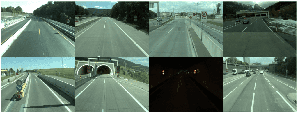Einige Beispielszenen aus dem ATSD, die die Vielfalt des Datensatzes verdeutlichen. Er umfasst rurale, urbane und montane Gebiete sowie eine Vielzahl von Tunneln.